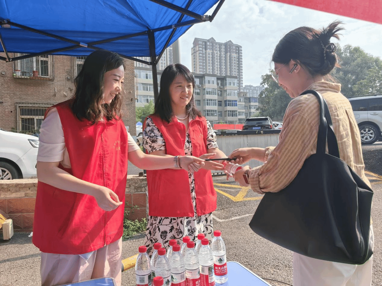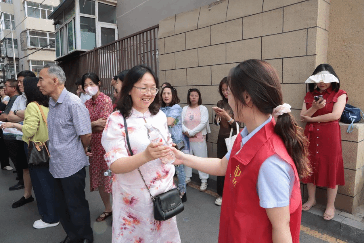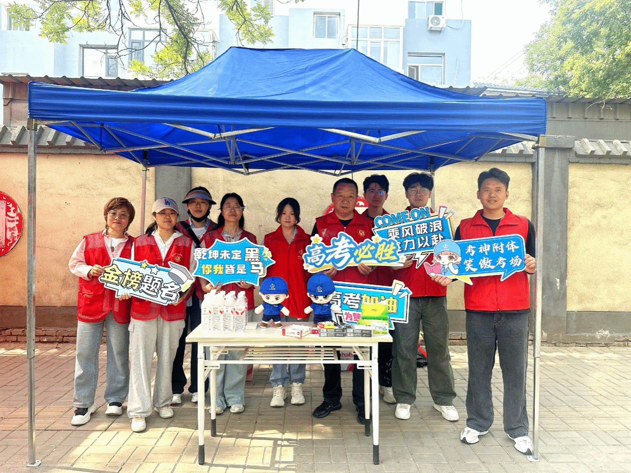 安裝集團聯(lián)合小店街道通達街社區(qū)在考點外設立高考暖心后援站,志愿者們早早開始忙碌,為考生和家長提供文具、飲用水等物資??紙鐾?,身著紅馬甲的志愿者們來回忙碌,成為一道靚麗的風景線。