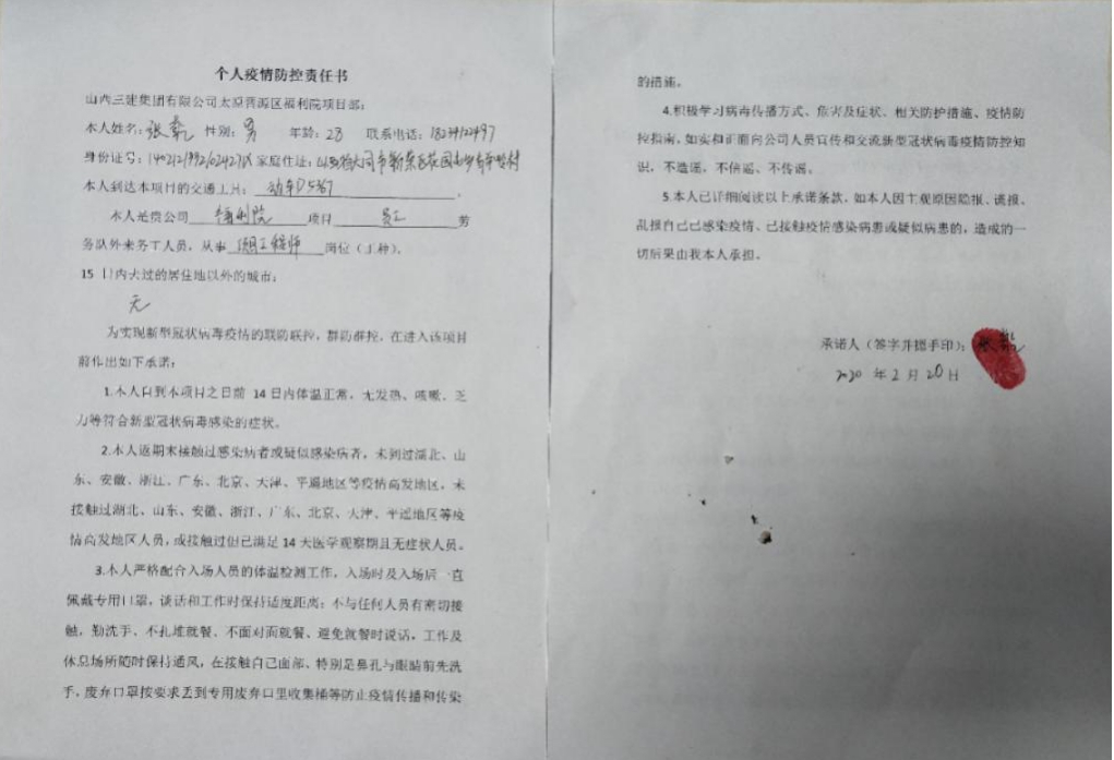 作為三建集團(tuán)首批復(fù)工復(fù)產(chǎn)項(xiàng)目,太原市晉源區(qū)福利院項(xiàng)目部管理人員、勞務(wù)人員全部投入緊張施工中,復(fù)工人員在進(jìn)入項(xiàng)目部前,必須簽訂《個(gè)人疫情防控責(zé)任書》。對(duì)每一名準(zhǔn)備進(jìn)入施工現(xiàn)場(chǎng)的勞務(wù)人員,進(jìn)門前要經(jīng)過“五道工序”:通過實(shí)名制通道、芯片打卡、測(cè)量體溫、消毒、體溫登記......完成這一系列動(dòng)作,才能正式進(jìn)入施工現(xiàn)場(chǎng)。