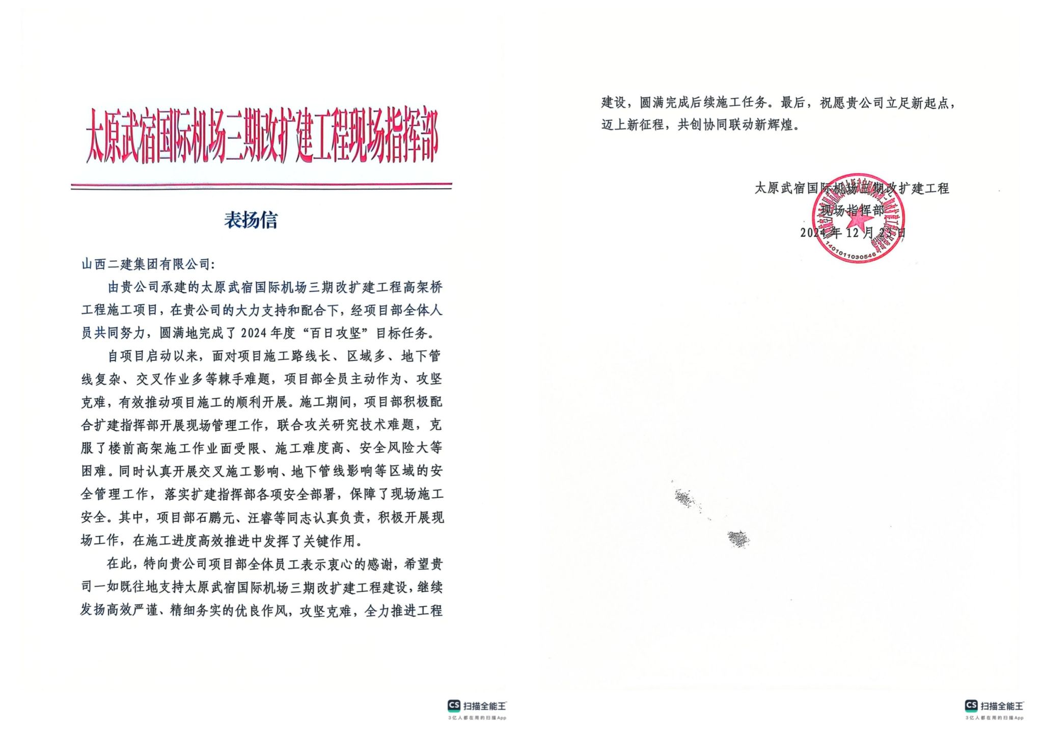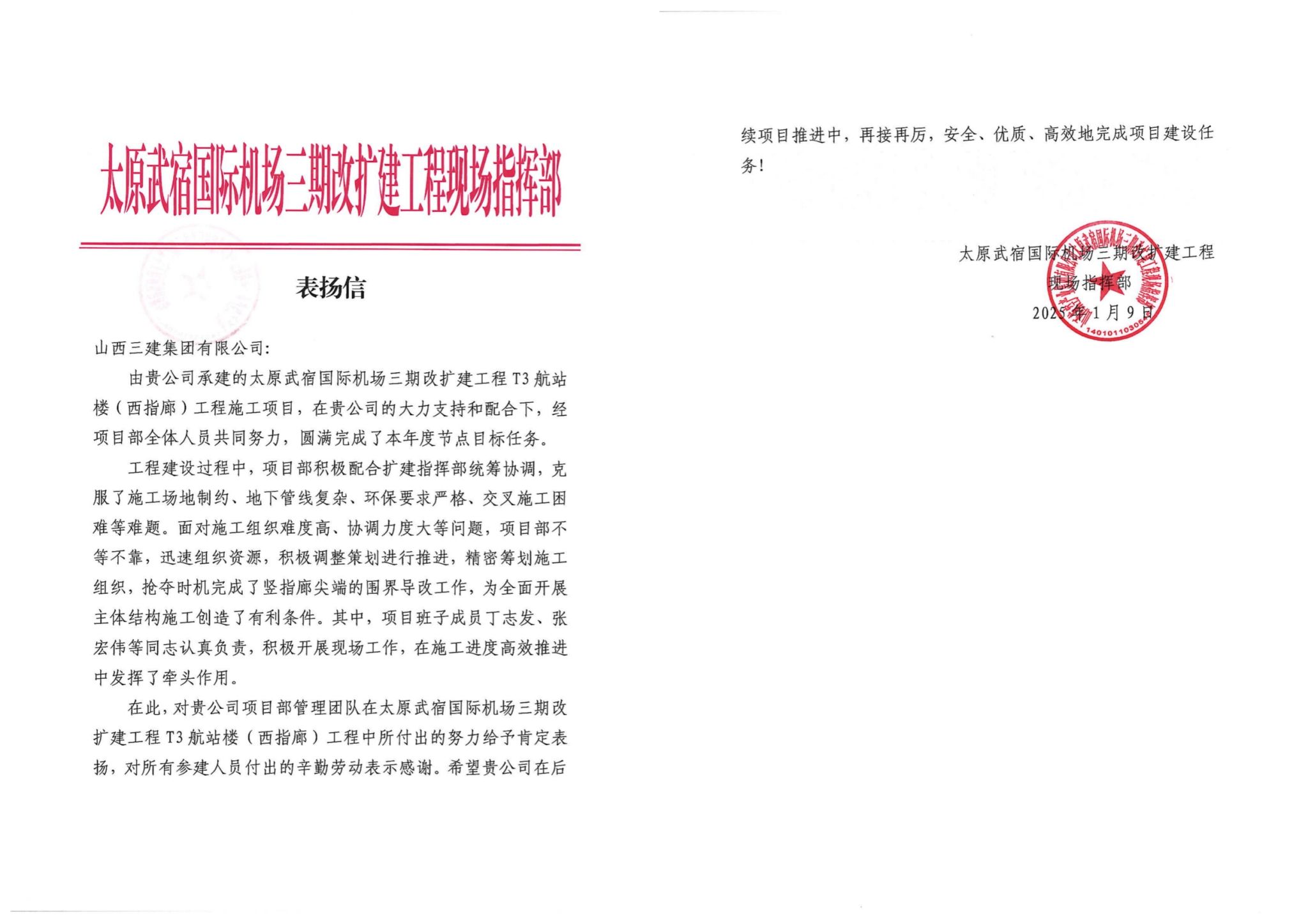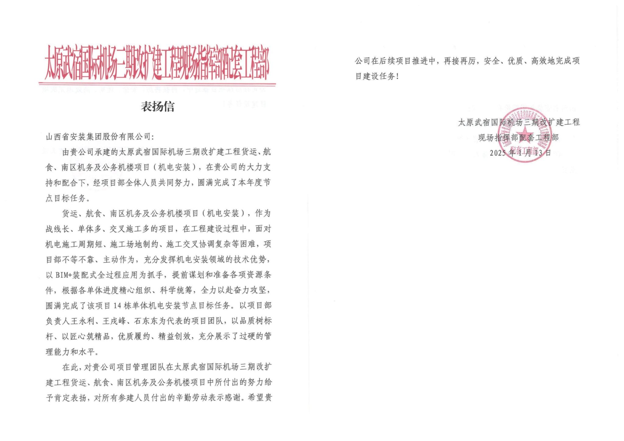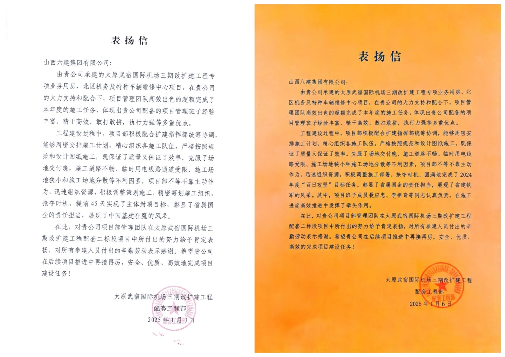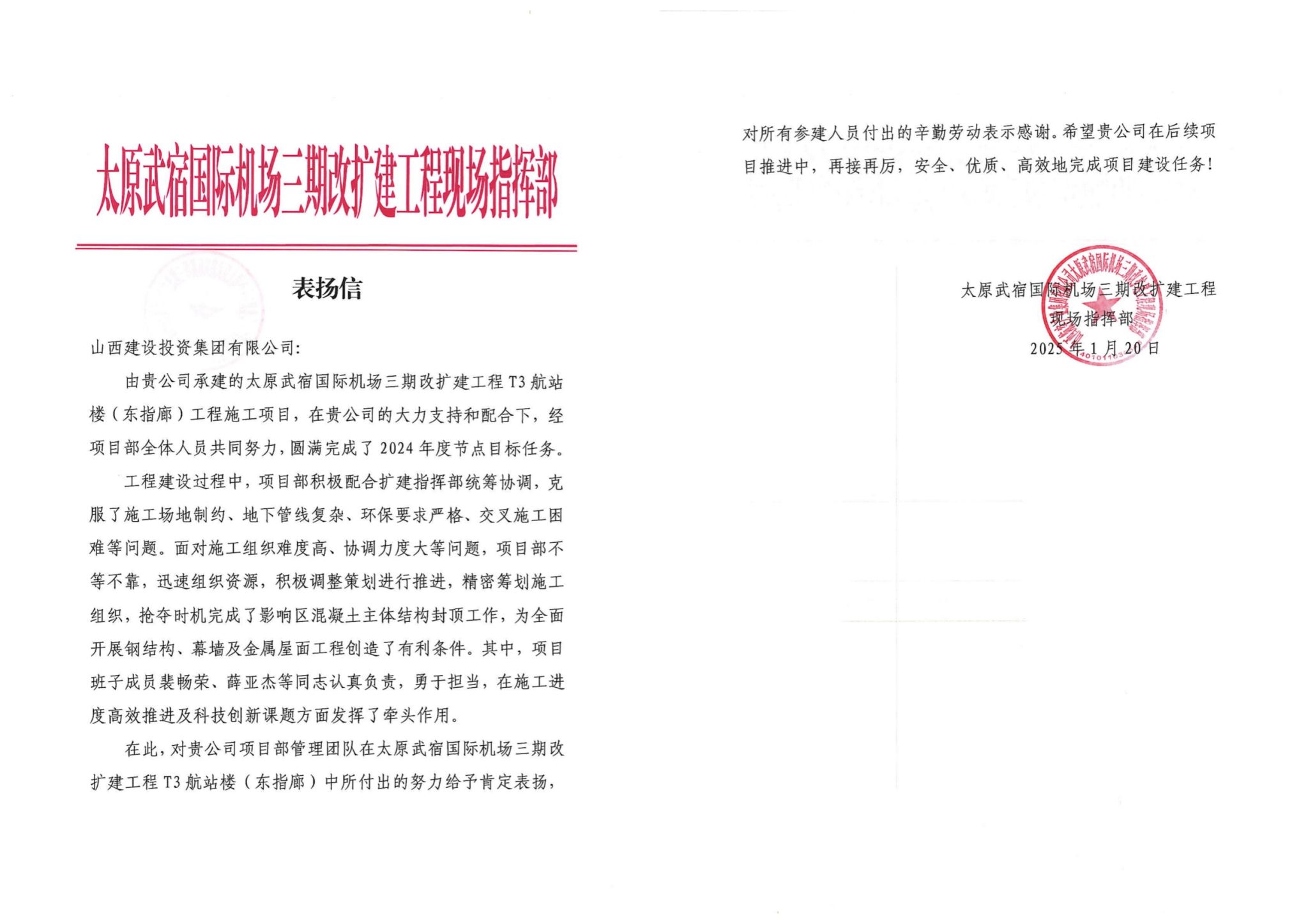 2025年初,T3航站樓,綜合交通中心,高架橋項(xiàng)目,場(chǎng)道工程一標(biāo)段,專(zhuān)項(xiàng)業(yè)務(wù)用房、北區(qū)機(jī)務(wù)及特種車(chē)輛維修中心,南區(qū)機(jī)務(wù)及公務(wù)機(jī)樓等項(xiàng)目的施工單位均收到建設(shè)方的表?yè)P(yáng)信。信中對(duì)各單位在項(xiàng)目建設(shè)中展現(xiàn)出的擔(dān)當(dāng)精神、專(zhuān)業(yè)能力和高效執(zhí)行力給予肯定,并贊揚(yáng)項(xiàng)目建設(shè)者們?cè)趶?fù)雜環(huán)境下積極配合指揮部統(tǒng)籌協(xié)調(diào),克服重重困難,壓茬推進(jìn)項(xiàng)目建設(shè),提前實(shí)現(xiàn)履約目標(biāo)的敬業(yè)精神。