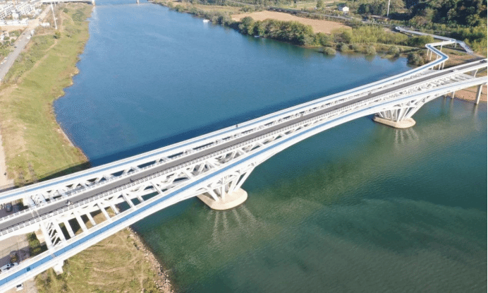 云碧峰大橋作為國內(nèi)首座掌托型連續(xù)鋼桁架剛構(gòu)橋,集主橋車輛通行與輔橋行人、非機(jī)動車通行功能于一體。工程涵蓋道路、橋梁、排水及景觀、交通標(biāo)志標(biāo)線等附屬設(shè)施,總投資2.32億元。其中主橋長714米、寬8米,最大跨度120米;東西輔橋分別長643米、827米,各寬4.5米。大橋橫跨上饒市信江,位于云碧峰公園北側(cè),是信江濕地公園核心出入口及連通云碧峰與濕地公園的標(biāo)志性工程。作為上饒市“加環(huán)路”交通體系的關(guān)鍵節(jié)點(diǎn),項(xiàng)目不僅完善了區(qū)域內(nèi)外交通路網(wǎng)骨架,更優(yōu)化了云碧峰森林公園生態(tài)休閑區(qū)交通布局,有效緩解城市擁堵,提升功能品質(zhì),為“大美上饒”建設(shè)與城市可持續(xù)發(fā)展注入強(qiáng)勁動能。