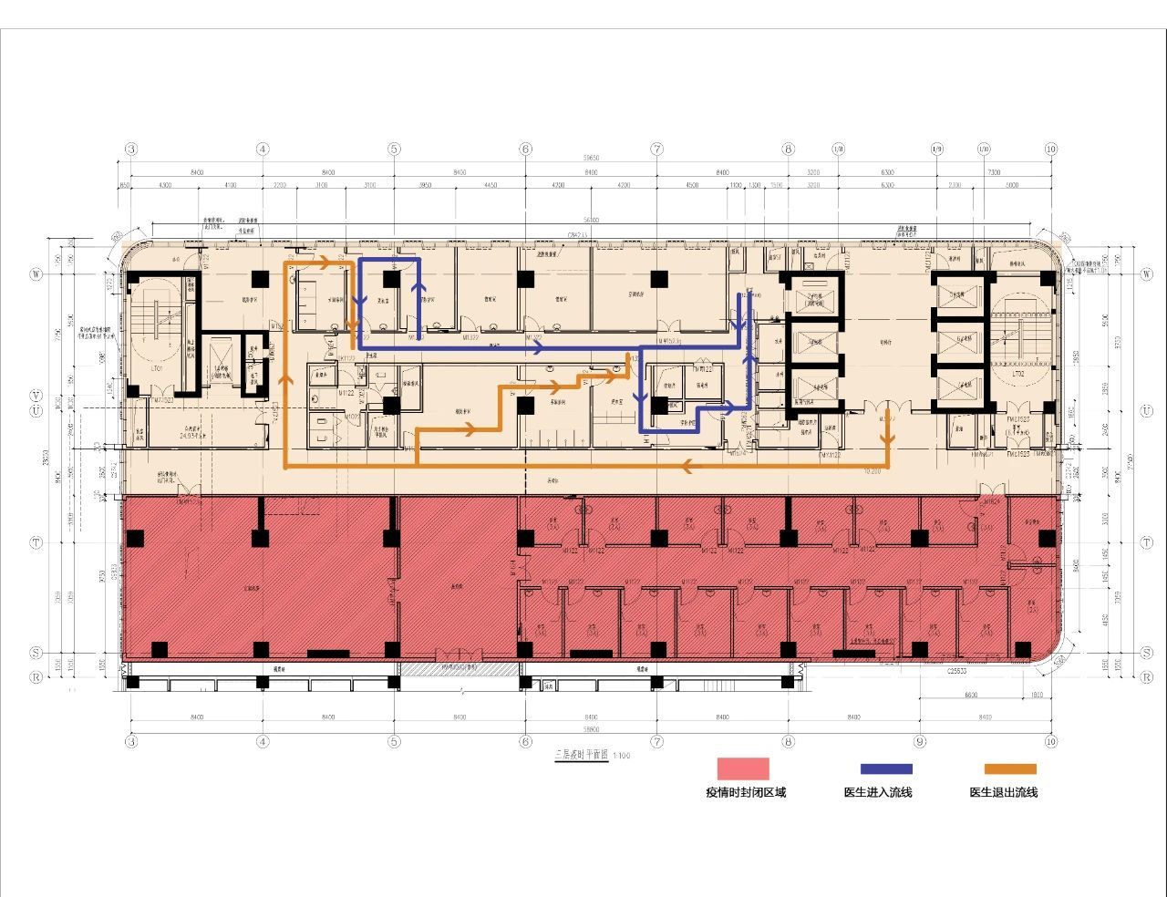 在局促狹窄的空間內(nèi),傳統(tǒng)的平面轉(zhuǎn)換模式效率低下、成本高昂。于是,團(tuán)隊(duì)首創(chuàng)性地提出并實(shí)踐了“垂直集中轉(zhuǎn)換”策略,實(shí)現(xiàn)了空間與效率的雙贏。該策略的核心在于縱向集成轉(zhuǎn)換功能:在疫病基地三層設(shè)置集中衛(wèi)生通過區(qū),作為醫(yī)護(hù)人員進(jìn)出污染病房層的唯一固定節(jié)點(diǎn),取代了傳統(tǒng)各層分散設(shè)置的冗余模式,顯著節(jié)省了寶貴的平面空間。醫(yī)護(hù)人員經(jīng)此區(qū)完成防護(hù)穿戴后,通過專用密閉電梯垂直直達(dá)目標(biāo)病房層;診療結(jié)束后,經(jīng)由特定路線(使用病患電梯)返回該區(qū)脫卸防護(hù)。這種垂直專用流線設(shè)計(jì),不僅嚴(yán)格保證了清潔區(qū)、半污染區(qū)、污染區(qū)的人員物理分離,還節(jié)省了改造功能的面積,確保日常醫(yī)療功能的高效運(yùn)行。