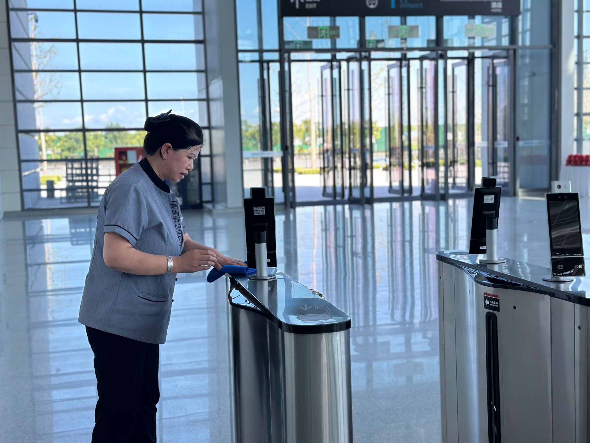 保潔團(tuán)隊(duì)提前10天對(duì)主會(huì)場(chǎng)、門(mén)廊、車(chē)庫(kù)雨棚開(kāi)展高空清洗,完成樓內(nèi)綠植租擺及養(yǎng)護(hù);對(duì)玻璃幕墻、石材墻面、外圍地面、電梯、消防通道等開(kāi)展集中精細(xì)化保潔,并于會(huì)前增加消殺頻次,為大會(huì)提供安全舒適的場(chǎng)館環(huán)境;展會(huì)期間,實(shí)施分區(qū)域、分時(shí)段清潔制度,對(duì)重點(diǎn)區(qū)域高頻次清掃,并分類(lèi)處理特殊垃圾,保持展館環(huán)境整潔有序。