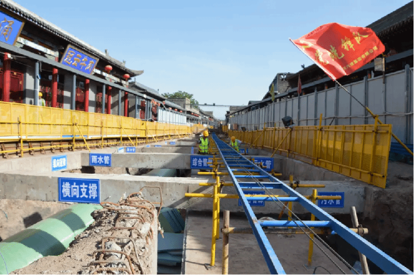 平遙古城是世界文化遺產(chǎn),項(xiàng)目團(tuán)隊(duì)秉持對(duì)文化遺產(chǎn)保護(hù)的高度自覺,前期對(duì)古城4條大街、121條小街巷、6600多戶居民、19處國家級(jí)文物保護(hù)單位及101處省縣級(jí)文物保護(hù)單位等進(jìn)行詳細(xì)摸底,并精準(zhǔn)校對(duì)20世紀(jì)70年代古城地形圖。在施工過程中,采用分區(qū)分段、多點(diǎn)錯(cuò)峰的施工策略,將工程劃分為4個(gè)片區(qū)穩(wěn)步推進(jìn),通過設(shè)置臨時(shí)橋架,改遷水、電、網(wǎng)絡(luò)線路,邀請(qǐng)專家勘察監(jiān)測、優(yōu)化施工方案,為每條街巷重塑“地下經(jīng)絡(luò)”。