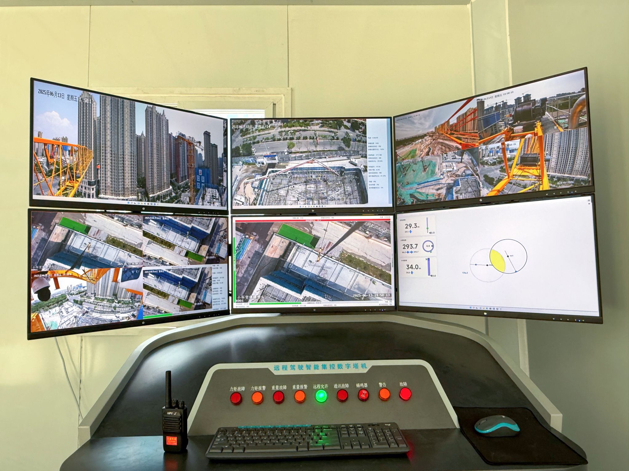 “雙模式智能聯(lián)動(dòng)駕駛”技術(shù)實(shí)現(xiàn)了高空駕駛艙操作與地面遠(yuǎn)程操控的無縫切換。塔機(jī)司機(jī)既可在駕駛艙內(nèi)開展傳統(tǒng)高空作業(yè),也可通過數(shù)字全景(5G)塔機(jī)集控駕駛艙,借助多塊曲面巨幕實(shí)時(shí)傳輸?shù)?60°作業(yè)影像完成遠(yuǎn)程操作。這種靈活的操作切換,不僅改善了塔機(jī)司機(jī)的作業(yè)環(huán)境、優(yōu)化了作業(yè)流程,更提升了操作的靈活性和響應(yīng)速度,有效降低極端氣候下的高空作業(yè)風(fēng)險(xiǎn)。