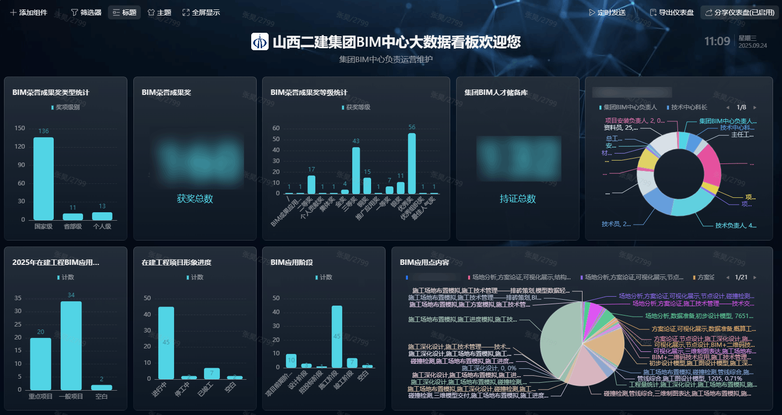 集團(tuán)層面強(qiáng)化頂層設(shè)計(jì),不僅編制出臺(tái)了《BIM技術(shù)應(yīng)用管理辦法》和《BIM應(yīng)用實(shí)施指南》等制度,更從大量實(shí)踐中提煉出125個(gè)關(guān)鍵的BIM價(jià)值點(diǎn),讓技術(shù)應(yīng)用有了清晰的價(jià)值導(dǎo)向;主動(dòng)參與3項(xiàng)山西省地方標(biāo)準(zhǔn)的制定,將企業(yè)的最佳實(shí)踐轉(zhuǎn)化為建筑行業(yè)的共同規(guī)范;搭建企業(yè)級(jí)BIM大數(shù)據(jù)看板,實(shí)現(xiàn)了對(duì)33家基層單位、所有在建項(xiàng)目的全過(guò)程動(dòng)態(tài)監(jiān)控,讓管理決策從“經(jīng)驗(yàn)驅(qū)動(dòng)”邁向“數(shù)據(jù)驅(qū)動(dòng)”。