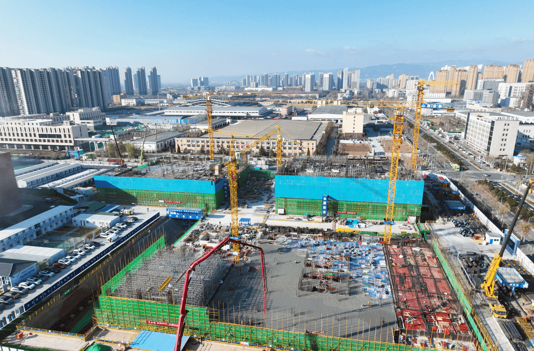 項(xiàng)目面臨結(jié)構(gòu)復(fù)雜、工期緊張、單位含鋼量達(dá)普通建筑三倍等多重挑戰(zhàn)。為此,團(tuán)隊(duì)將精細(xì)化理念貫穿技術(shù)攻堅(jiān)全程,以技術(shù)預(yù)控和方案創(chuàng)新推動(dòng)資源優(yōu)化與效率提升。例如,在塔吊布置環(huán)節(jié),經(jīng)反復(fù)模擬驗(yàn)證,將塔吊數(shù)量由3臺(tái)增至5臺(tái),并創(chuàng)新采用“承臺(tái)基礎(chǔ)+承臺(tái)梁+防水板”與塔吊基礎(chǔ)一體化承載體系,既減少獨(dú)立基礎(chǔ)施工量,也顯著提升吊裝效率。面對(duì)高水位、高靈敏性土質(zhì),團(tuán)隊(duì)運(yùn)用中心島開(kāi)挖法,實(shí)施分階段開(kāi)挖與同步支護(hù),結(jié)合出土量動(dòng)態(tài)監(jiān)控,僅用35天完成25萬(wàn)方土方外運(yùn),為后續(xù)施工爭(zhēng)取主動(dòng)。主體結(jié)構(gòu)施工中,團(tuán)隊(duì)進(jìn)一步采用“施工段劃分+流水作業(yè)”模式,借助每日生產(chǎn)例會(huì)精準(zhǔn)協(xié)調(diào)工序銜接,確保各環(huán)節(jié)有序推進(jìn)。這一系列精細(xì)舉措,最終成就了“35天完成正負(fù)零、60天實(shí)現(xiàn)主體封頂”的安裝速度。