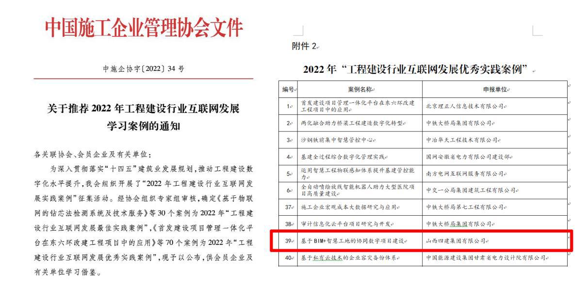 同時(shí),該案例還獲評(píng)中施企協(xié)2022年“工程建設(shè)行業(yè)互聯(lián)網(wǎng)發(fā)展優(yōu)秀實(shí)踐案例”,被中施企協(xié)推薦為學(xué)習(xí)案例。