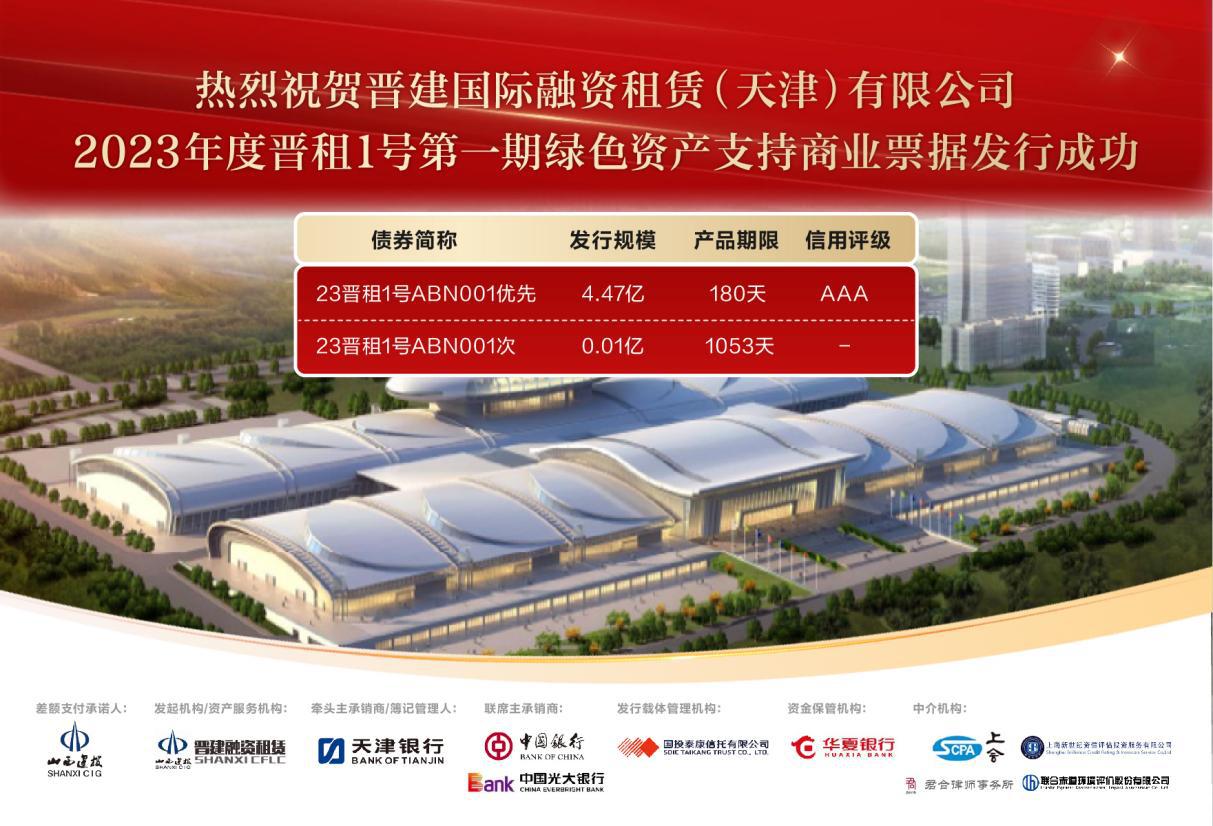 3月17日,晉建國際融資租賃(天津)公司2023年度晉租1號第一期綠色定向資產支持商業(yè)票據在中國銀行間市場交易商協(xié)會成功發(fā)行。本次綠色資產支持商業(yè)票據是山西省首單以綠色租賃債權為底層資產發(fā)行的資產證券化產品,采用儲架分期發(fā)行模式,儲架規(guī)模10億元,本期發(fā)行4.48億元,總期限不超過3年。