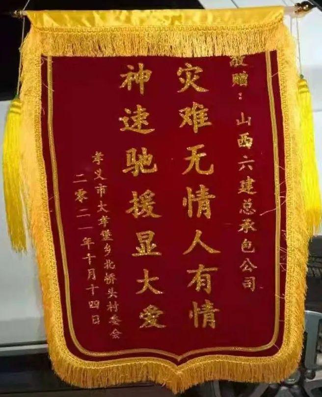 10月9日23時,六建集團總承包公司得知孝義市大孝堡鎮(zhèn)北橋頭村受災(zāi)嚴重,迅速組織防汛救災(zāi)愛心捐贈行動,不到半天時間,第二天中午就為村里捐贈了發(fā)電機1臺、污水泵6臺、水帶225米、雨衣20件、雨鞋20雙,并送到了村里。家住孝義市大孝堡鎮(zhèn)北橋頭村的員工梁月新自制愛心條幅,在捐贈物資的同時,幫助老鄉(xiāng)提振信心,點燃希望!