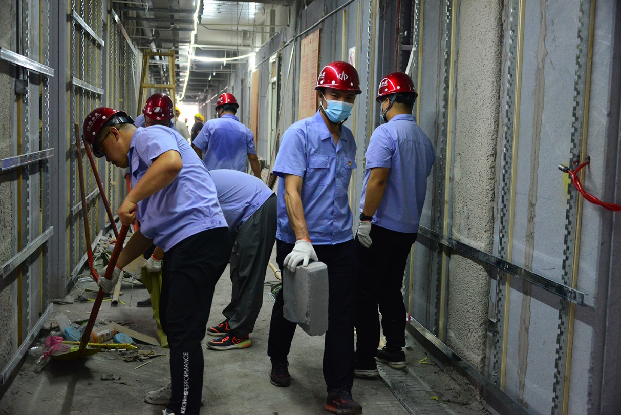 本次義務(wù)勞動主要是清理樓層內(nèi)的建筑垃圾、打掃現(xiàn)場衛(wèi)生等。在勞動現(xiàn)場,大家頭戴安全帽,手拿鐵鍬、掃把等工具,甩開臂膀,投入到緊張的勞動當中。盛夏時節(jié),氣溫較高,汗水很快浸透了衣服,汗水與灰塵凝結(jié)在一起,大家切身體會到了項目一線員工的艱辛。