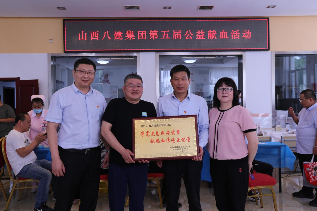 太原市血液中心副主任周源向八建集團(tuán)多年來對無償獻(xiàn)血公益事業(yè)的大力支持和獻(xiàn)血志愿者們的無私奉獻(xiàn)表示由衷贊賞和衷心感謝,將題有“學(xué)黨史為民辦實事,獻(xiàn)熱血傳遞正能量”的牌匾贈予集團(tuán)。
