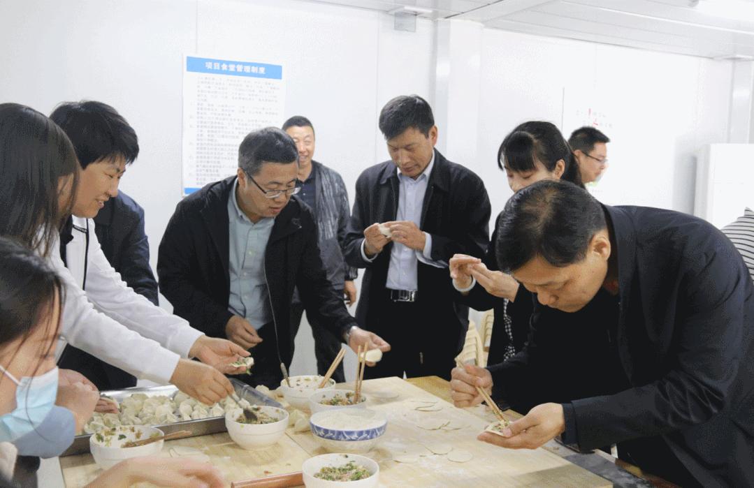 午餐時間,張增伏與慰問團成員在項目上和工人們一起包餃子、過“集體生日”。