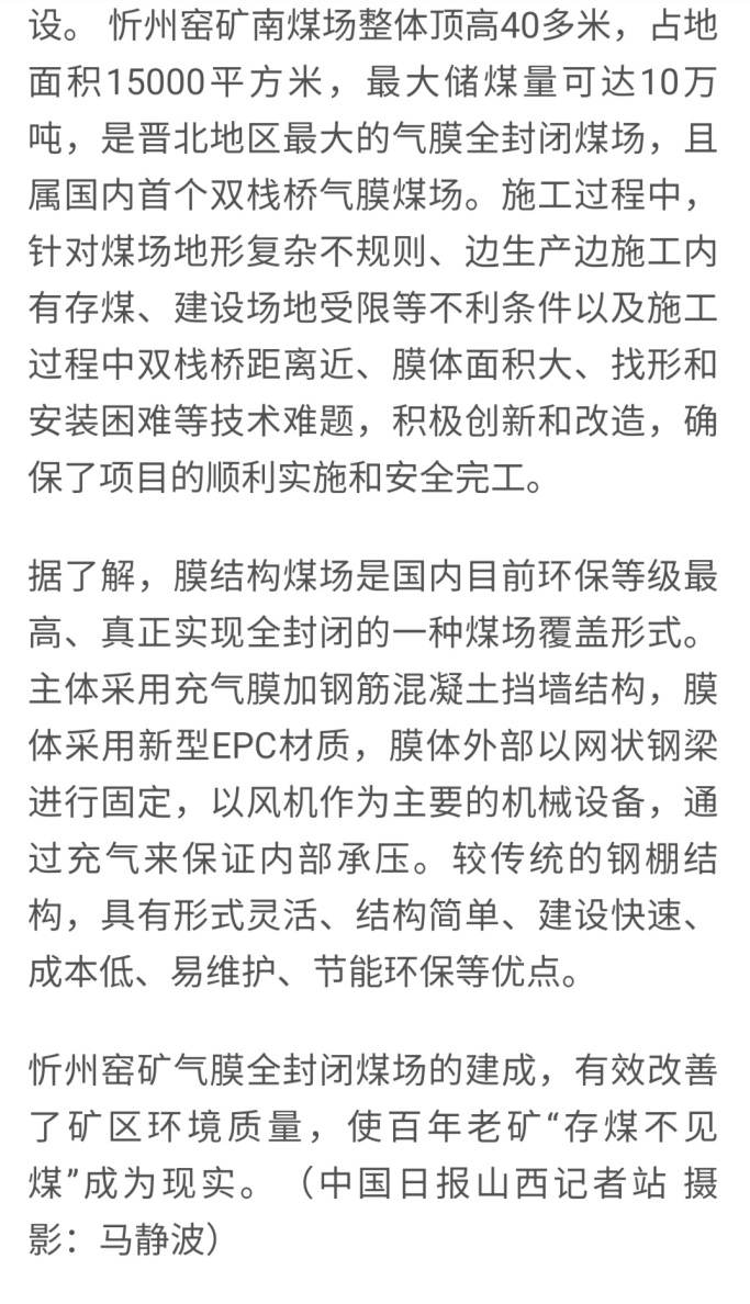 忻州窯礦氣膜全封閉煤場的建成,有效改善了礦區(qū)環(huán)境質(zhì)量,使百年老礦“存煤不見煤”成為現(xiàn)實(shí)。