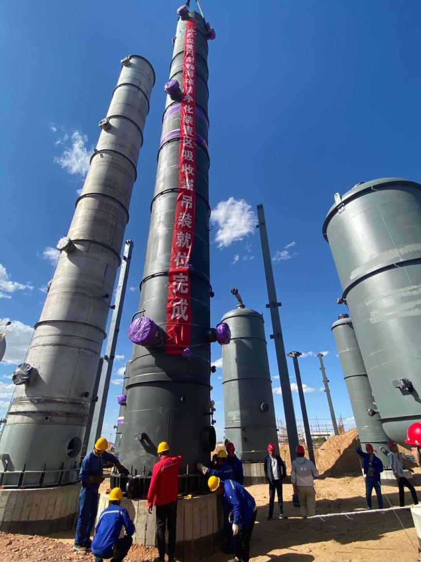 該項目的高、大、重設備均屬于危大施工作業(yè),設備安裝時吊裝場地相對狹小、人員緊張,因此施工難度較大。吊裝前,項目技術(shù)人員與施工人員反復查看場地,細致研討吊裝細節(jié),制訂了合理的專項施工方案,順利完成了設備進廠、吊車進廠等一系列準備工作,最終實現(xiàn)凈化裝置區(qū)吸收塔一次吊裝成功。