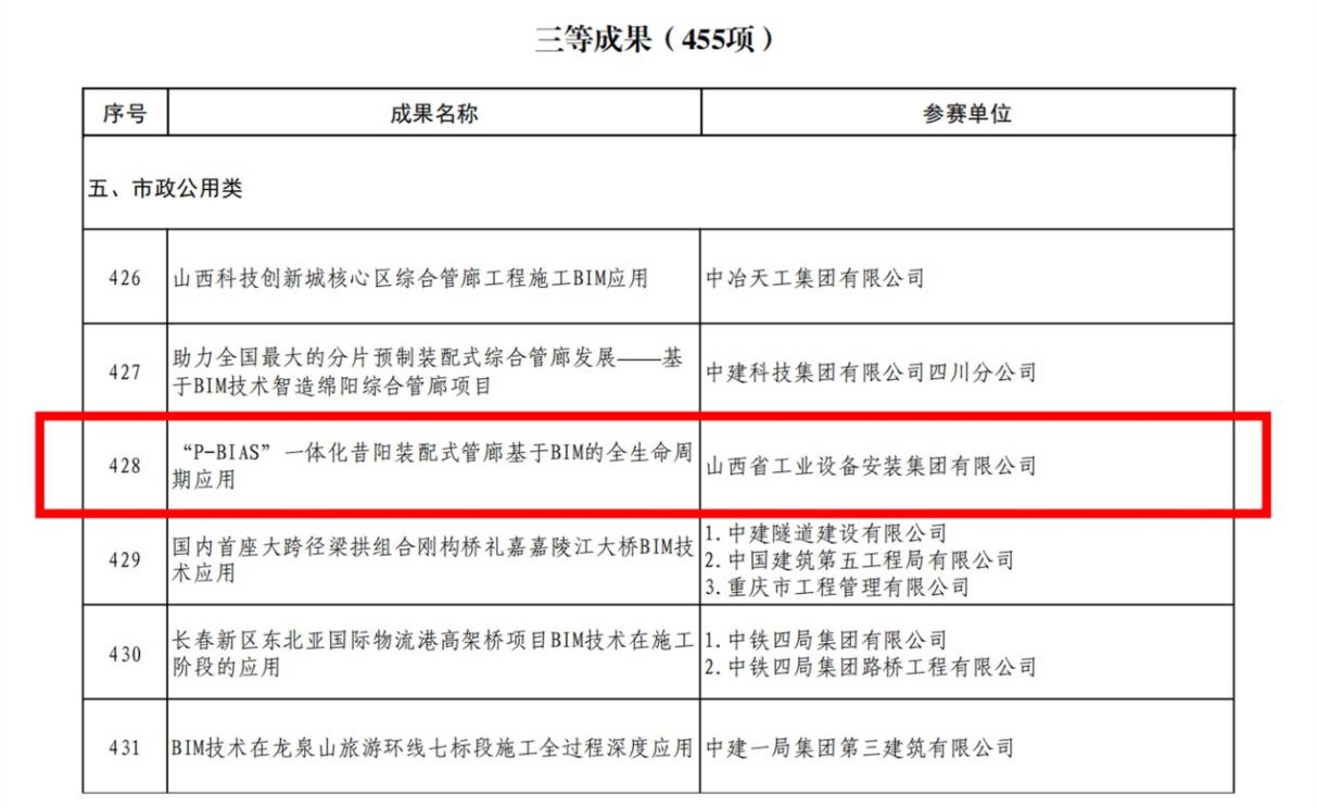 近日,中國施工企業(yè)管理協(xié)會首屆工程建設(shè)行業(yè)BIM大賽結(jié)果揭曉,公司申報的“BIM技術(shù)在伊甸創(chuàng)新創(chuàng)業(yè)基地1-4#中的綜合應用”榮獲建筑工程綜合應用類一等成果,“‘P-BIAS’一體化昔陽裝配式管廊基于BIM的全生命周期應用”榮獲市政公用類三等成果。其中,“BIM技術(shù)在伊甸創(chuàng)新創(chuàng)業(yè)基地1-4#中的綜合應用”是全國61項一類成果中唯一由省屬企業(yè)獨立完成的成果。