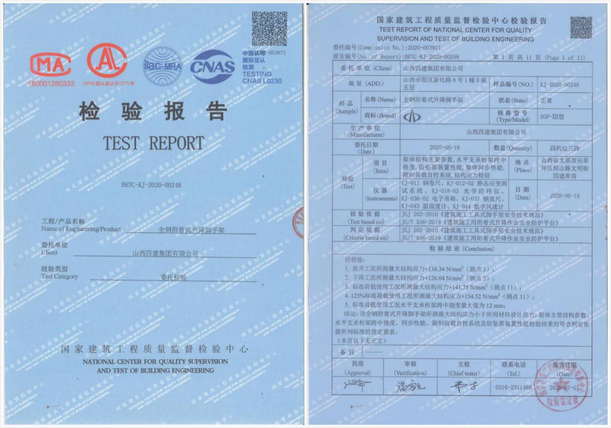 近日,國家建筑工程質量監(jiān)督檢驗中心對公司模架科技分公司最新研發(fā)的SGP-III型全鋼附著式升降腳手架進行性能檢測。通過為期兩天的防墜實驗、荷載實驗、超載實驗,各項數(shù)據(jù)均符合標準。國家建筑工程質量監(jiān)督檢驗中心主任王峰對公司自主研發(fā)的雛鷹式防墜器的防墜功能給予了充分肯定,SGP-III型全鋼附著式升降腳手架順利通過驗收。