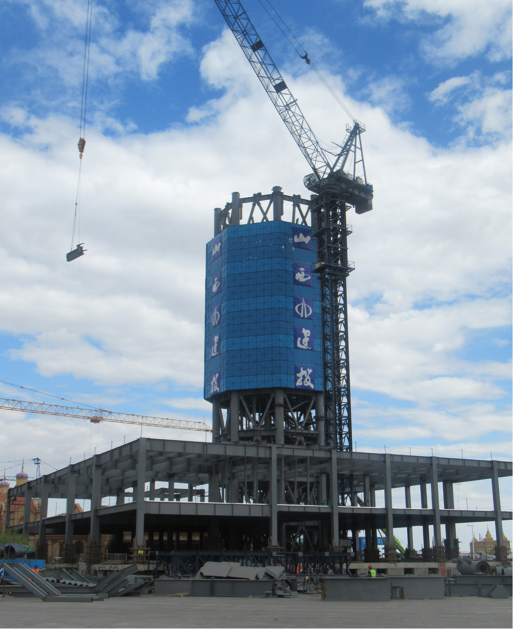 在中俄邊境內(nèi)蒙古滿洲里市,百余名建工人日夜奮戰(zhàn),一座超高層鋼結(jié)構(gòu)地標(biāo)性建筑正在拔地而起。