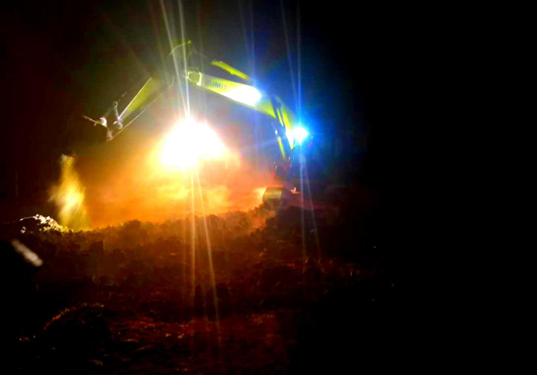 在施工隊伍連夜作業(yè)時,急降驟雨,大家冒雨與時間賽跑。由于火情點地形復雜,山林荊棘密布,施工條件十分苛刻,機械設備操作人員、現(xiàn)場管理人員累了就在挖掘機旁瞇一會,餓了就吃包泡面抗一抗。
