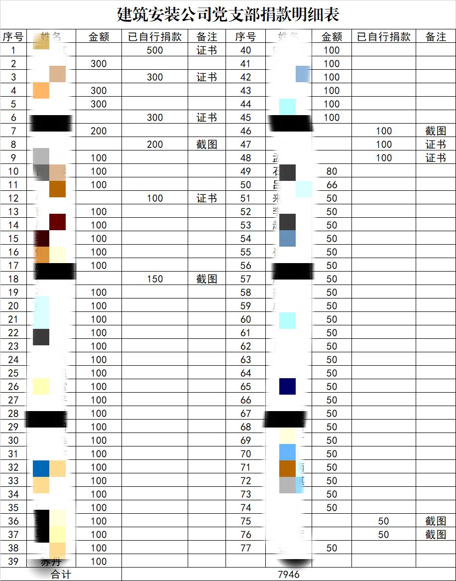 面對(duì)嚴(yán)峻的疫情防控形勢(shì),公司黨委向全體建工人發(fā)出募捐倡議,五分公司上下積極響應(yīng)捐款倡議,截止目前共計(jì)195人捐款,捐款金額15480元。此外,還有11名員工自主通過騰訊、支付寶等平臺(tái)捐款660元。