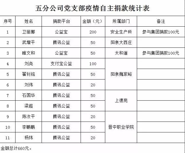 同時(shí),公司黨委積極響應(yīng)山西省紅十字會(huì)抗擊新型冠狀病毒感染肺炎接收社會(huì)捐贈(zèng)的公告,及時(shí)發(fā)布《抗擊疫情、共渡難關(guān)募捐倡議書》,一時(shí)間,公司上下全體職工積極踐行社會(huì)責(zé)任,主動(dòng)奉獻(xiàn)愛心,通過各所屬公司、黨支部踴躍捐款,匯聚力量,共同馳援肺炎疫情防控阻擊戰(zhàn)。短短兩日,共募捐善款273300元,以實(shí)際行動(dòng)踐行了一方有難,八方馳援;病毒無情,人間有愛的國(guó)企擔(dān)當(dāng)和同舟共濟(jì)、抗擊疫情的必勝?zèng)Q心。