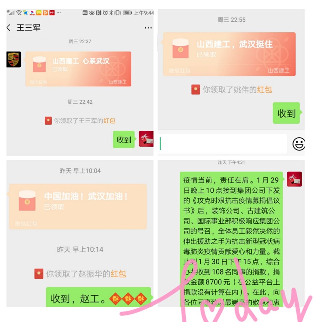 防疫攻堅(jiān)戰(zhàn)進(jìn)入關(guān)鍵時(shí)期,裝飾公司、古建筑公司、國(guó)際事業(yè)部號(hào)召全體員工愛心捐款,以實(shí)際行動(dòng)為打贏疫情防控戰(zhàn)貢獻(xiàn)力量,全體員工積極響應(yīng)號(hào)召,踴躍捐款,相信我們只要團(tuán)結(jié)一致,聽從黨的指揮,一定能盡早打贏這場(chǎng)沒有硝煙的戰(zhàn)役,武漢加油!中國(guó)加油!