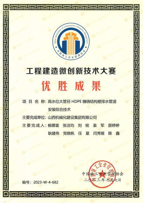 《高水位大管徑HDPE纏繞結(jié)構(gòu)壁排水管道安裝綜合技術(shù)》獲得中施企協(xié)“工程建造微創(chuàng)新技術(shù)大賽優(yōu)勝成果”