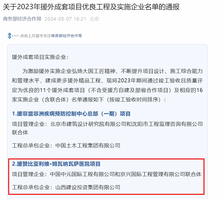 近日,商務(wù)部國際經(jīng)濟(jì)合作事務(wù)局發(fā)布2023年援外成套項(xiàng)目優(yōu)良工程及實(shí)施企業(yè)通報(bào)表揚(yáng)名單。由山西建投國際建設(shè)集團(tuán)實(shí)施的援贊比亞利維·姆瓦納瓦薩醫(yī)院項(xiàng)目,被商務(wù)部授予“援外成套項(xiàng)目優(yōu)良工程”。