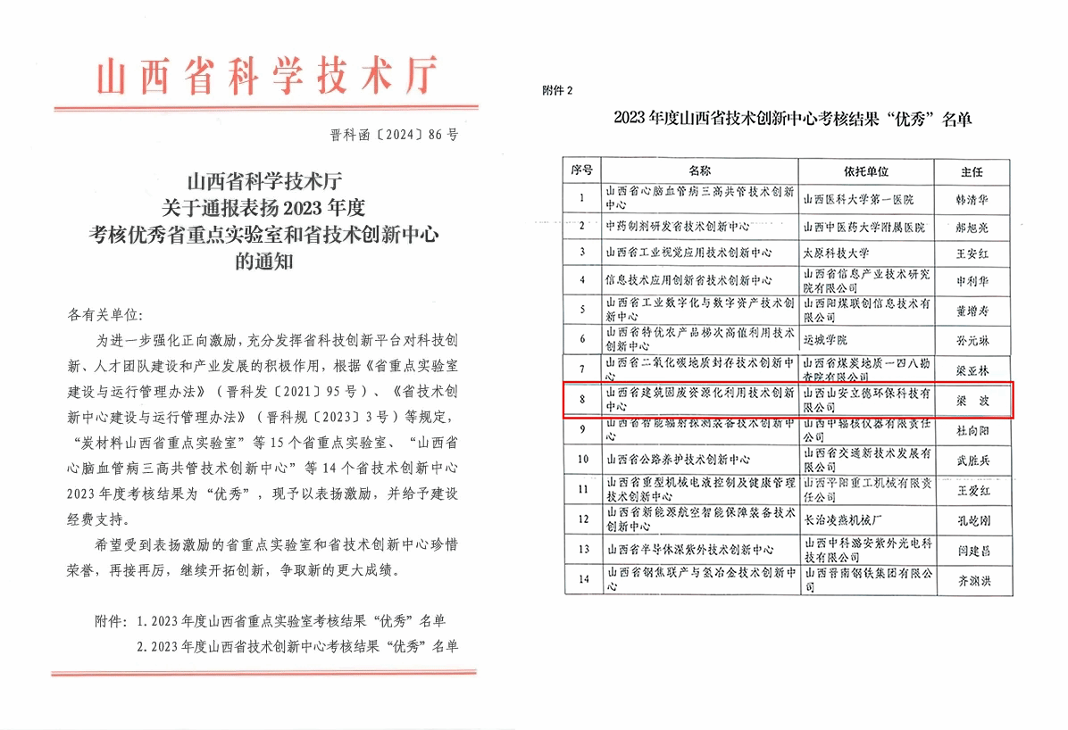 近日,山西省科學(xué)技術(shù)廳發(fā)布2023年度考核優(yōu)秀省技術(shù)創(chuàng)新中心名單,山西建投安裝集團(tuán)牽頭建設(shè)的山西省建筑固廢資源化利用技術(shù)創(chuàng)新中心在年度考核中獲得“優(yōu)秀”,也是環(huán)境領(lǐng)域類全省唯一一個(gè)被評(píng)為優(yōu)秀的科技創(chuàng)新平臺(tái)。