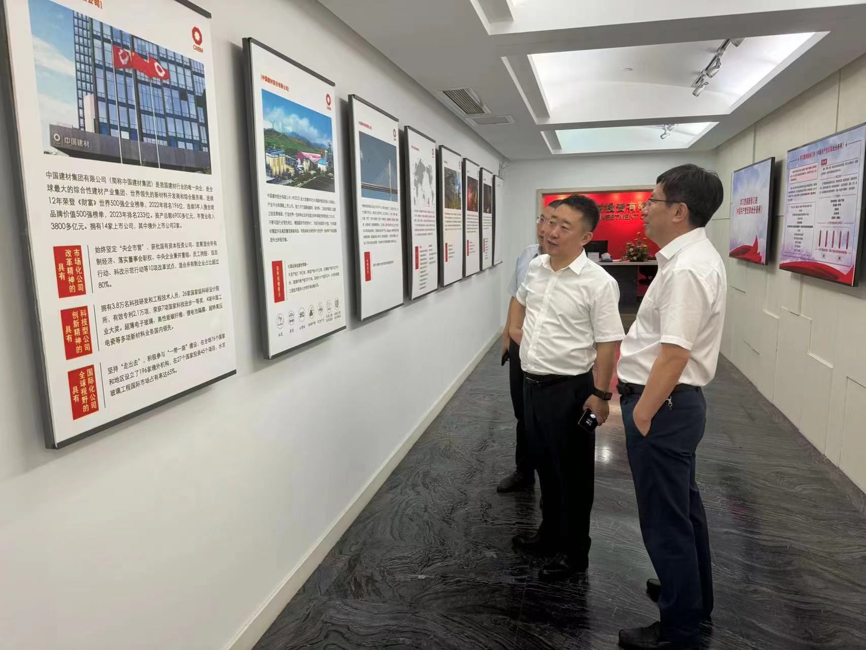 劉建偉一行還參觀了中建材投資有限公司企業(yè)文化展廳,聽取中建材海外經(jīng)濟(jì)合作有限公司董事長張欣對中建材投資歷史沿革、組織架構(gòu)、國際化和集采供應(yīng)鏈業(yè)務(wù)戰(zhàn)略定位、發(fā)展現(xiàn)狀、經(jīng)營業(yè)績、發(fā)展布局等情況介紹。