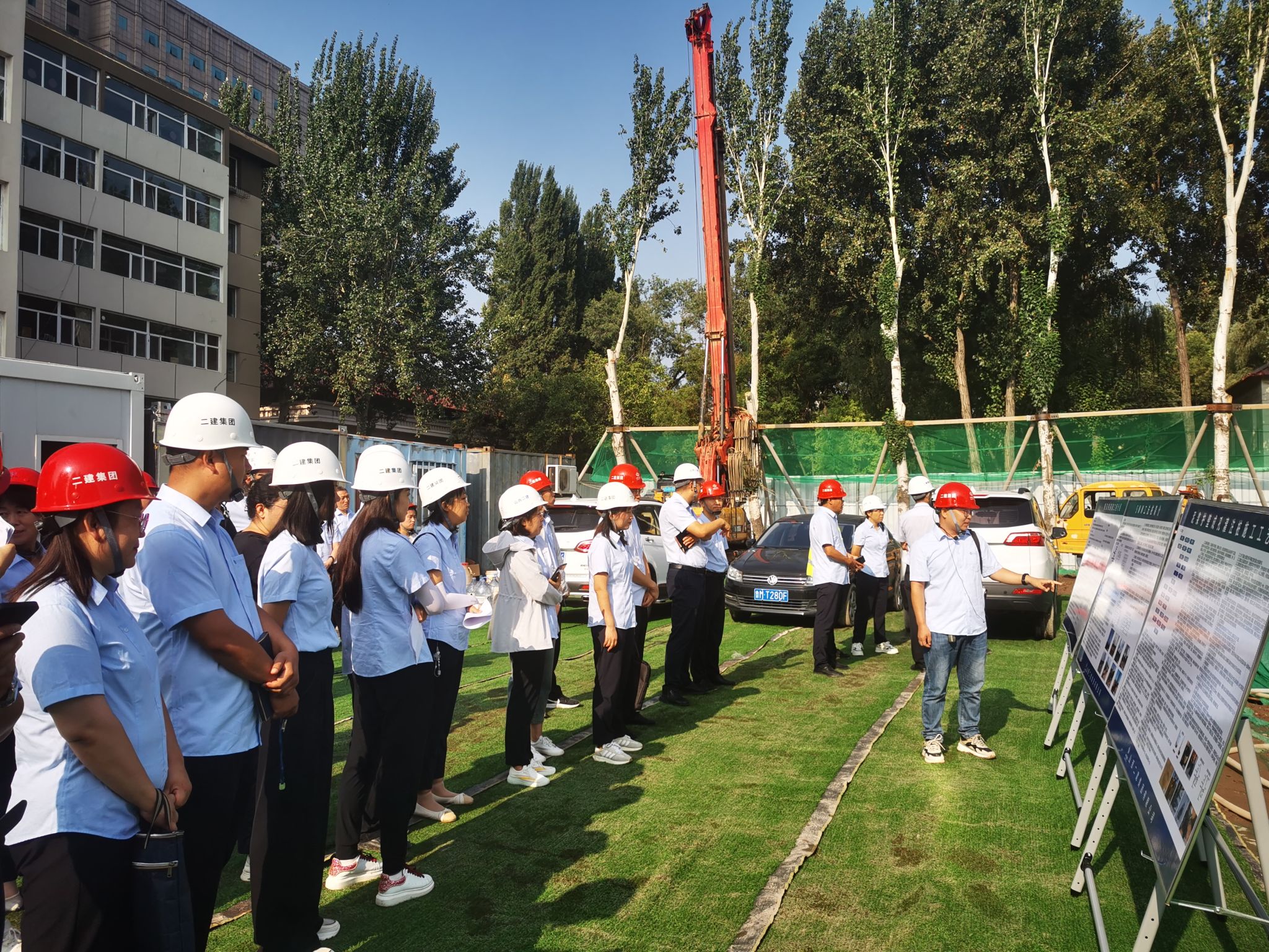 現場人員觀摩了桃園居項目基坑支護及降水、泥漿護壁灌注樁施工。項目技術負責人結合施工現場情況對“樁與樁基礎工程介紹”“SMW工法樁施工工藝”和“泥漿護壁成孔灌注樁施工工藝”三個展板內容及現場樁基施工過程進行詳細講解。