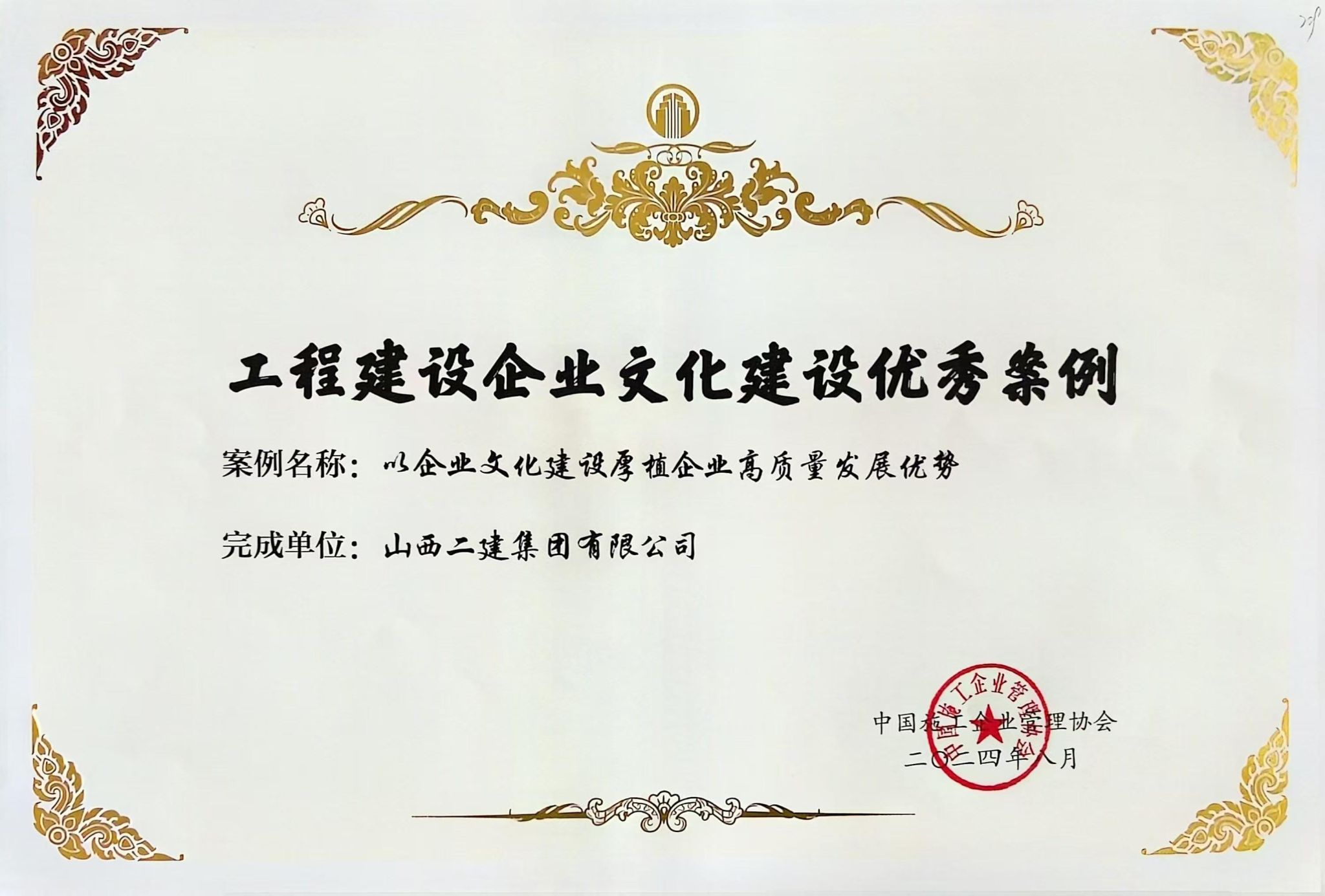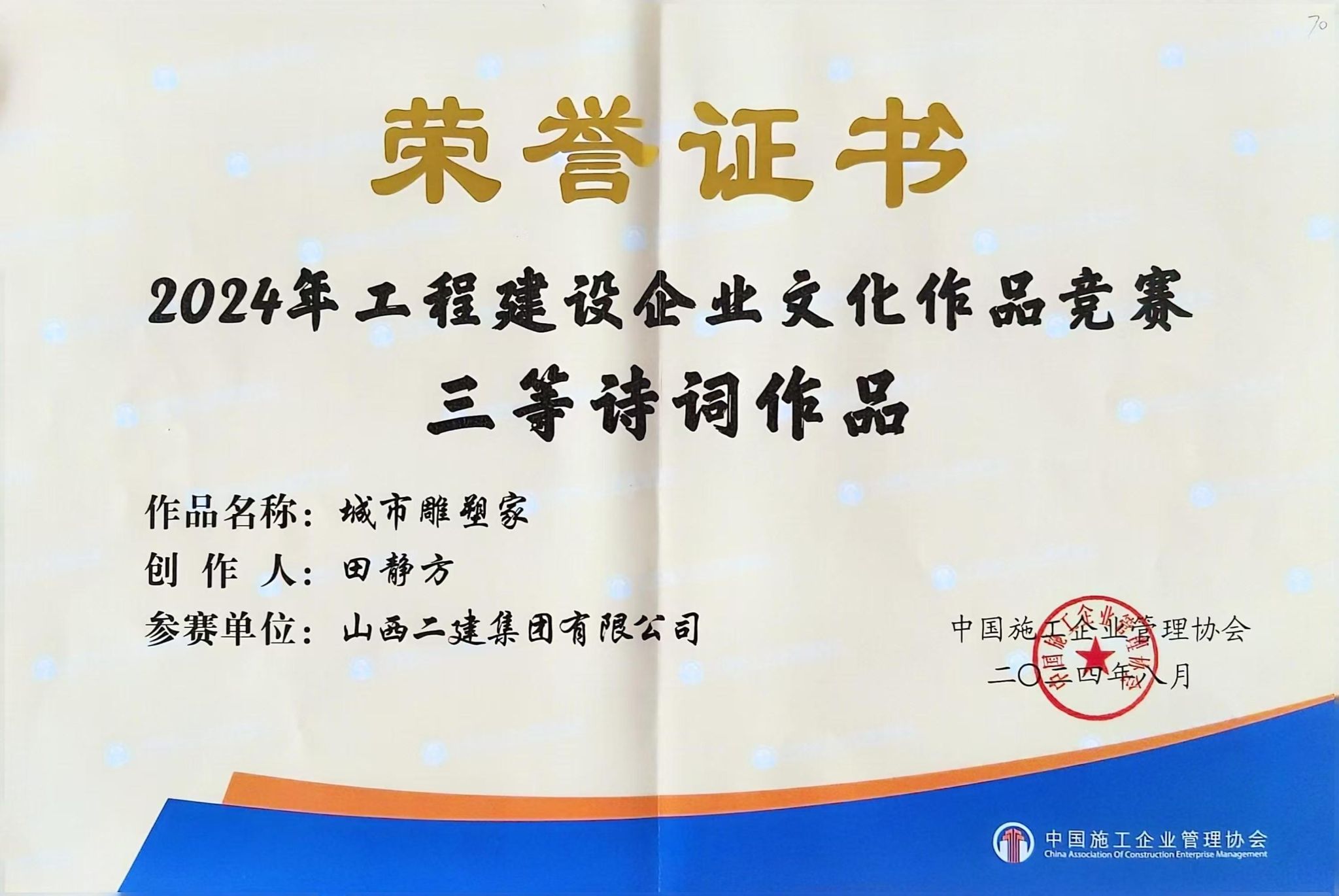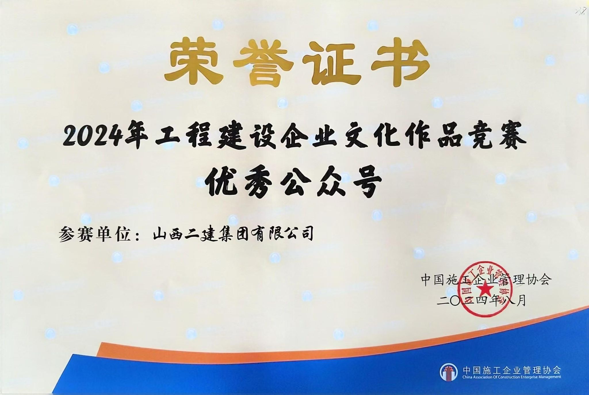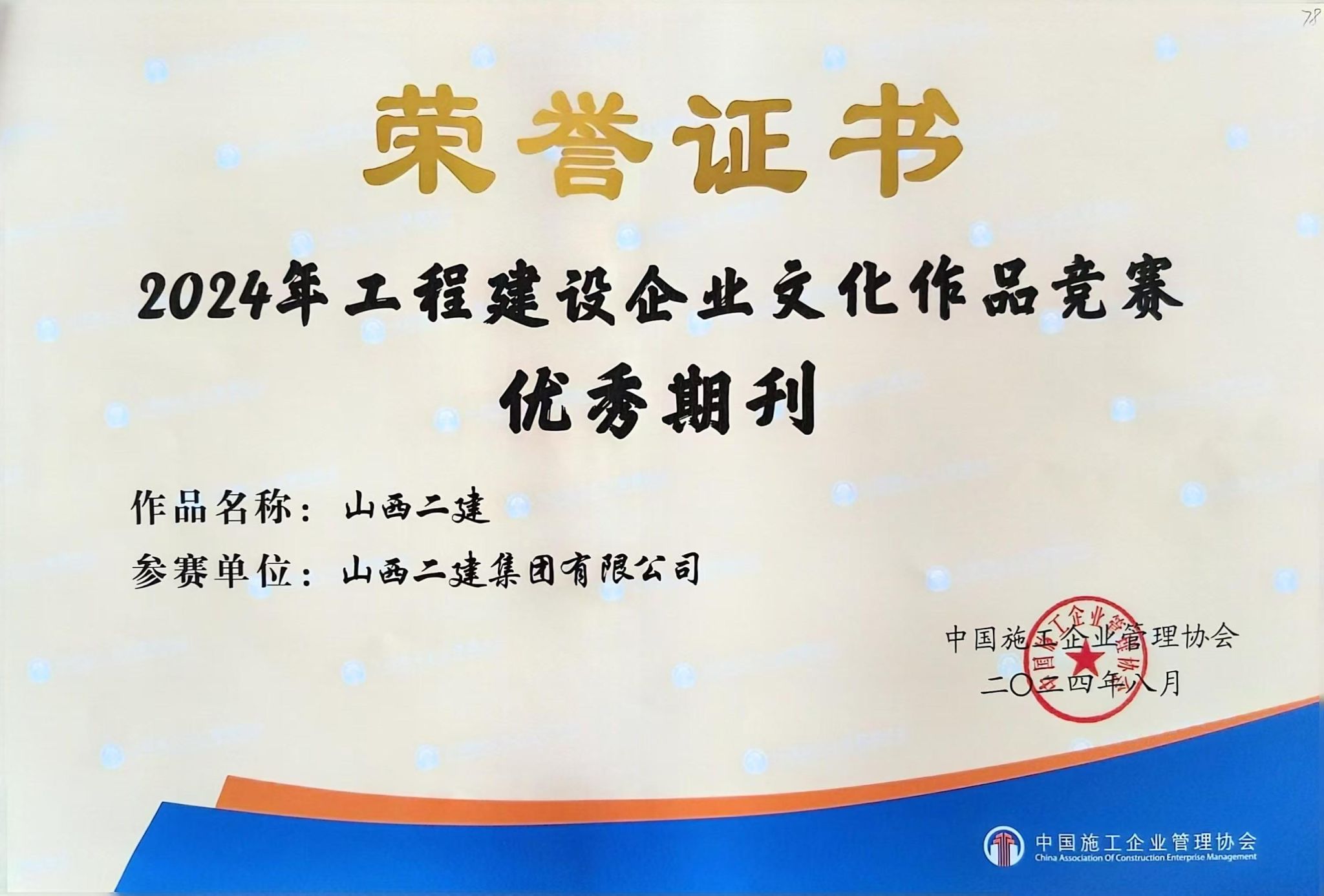 9月5日至6日,在2024年工程建設企業(yè)文化建設成果交流會上,山西建投二建集團微信公眾號、《山西二建》內刊分別榮獲2024年工程建設企業(yè)優(yōu)秀公眾號、優(yōu)秀期刊,案例《以企業(yè)文化建設厚植企業(yè)高質量發(fā)展優(yōu)勢》榮獲2024年工程建設企業(yè)文化建設優(yōu)秀案例,職工創(chuàng)作的繪畫及詩詞作品分別榮獲二等獎、三等獎。