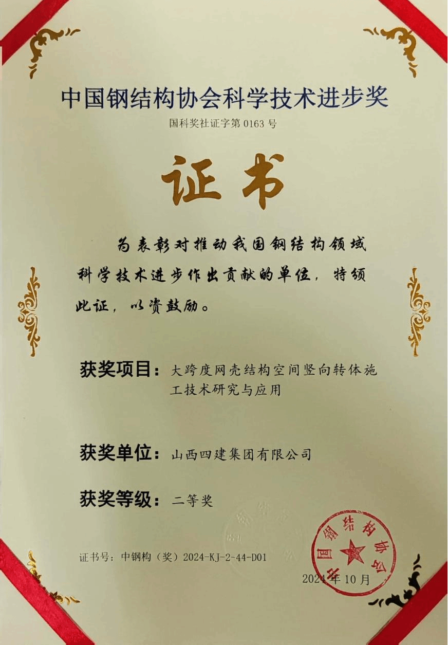 近日,中國(guó)鋼結(jié)構(gòu)協(xié)會(huì)成立四十周年紀(jì)念大會(huì)暨2024中國(guó)鋼結(jié)構(gòu)大會(huì)在北京召開,山西建投四建集團(tuán)申報(bào)的《大跨度網(wǎng)殼結(jié)構(gòu)空間豎向轉(zhuǎn)體施工技術(shù)研究與應(yīng)用》獲評(píng)2024年中國(guó)鋼結(jié)構(gòu)協(xié)會(huì)科學(xué)技術(shù)進(jìn)步獎(jiǎng)二等獎(jiǎng)。