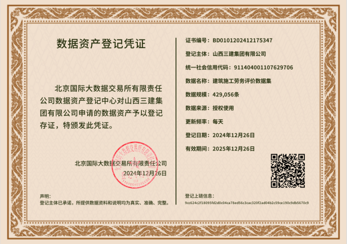 12月26日,山西建投三建集團(tuán)在北京國(guó)際大數(shù)據(jù)交易所成功完成“建筑施工勞務(wù)評(píng)價(jià)數(shù)據(jù)集”數(shù)據(jù)資產(chǎn)登記,并成功實(shí)現(xiàn)數(shù)據(jù)資產(chǎn)入表,成為全國(guó)首例建筑施工勞務(wù)數(shù)據(jù)入表企業(yè)。
