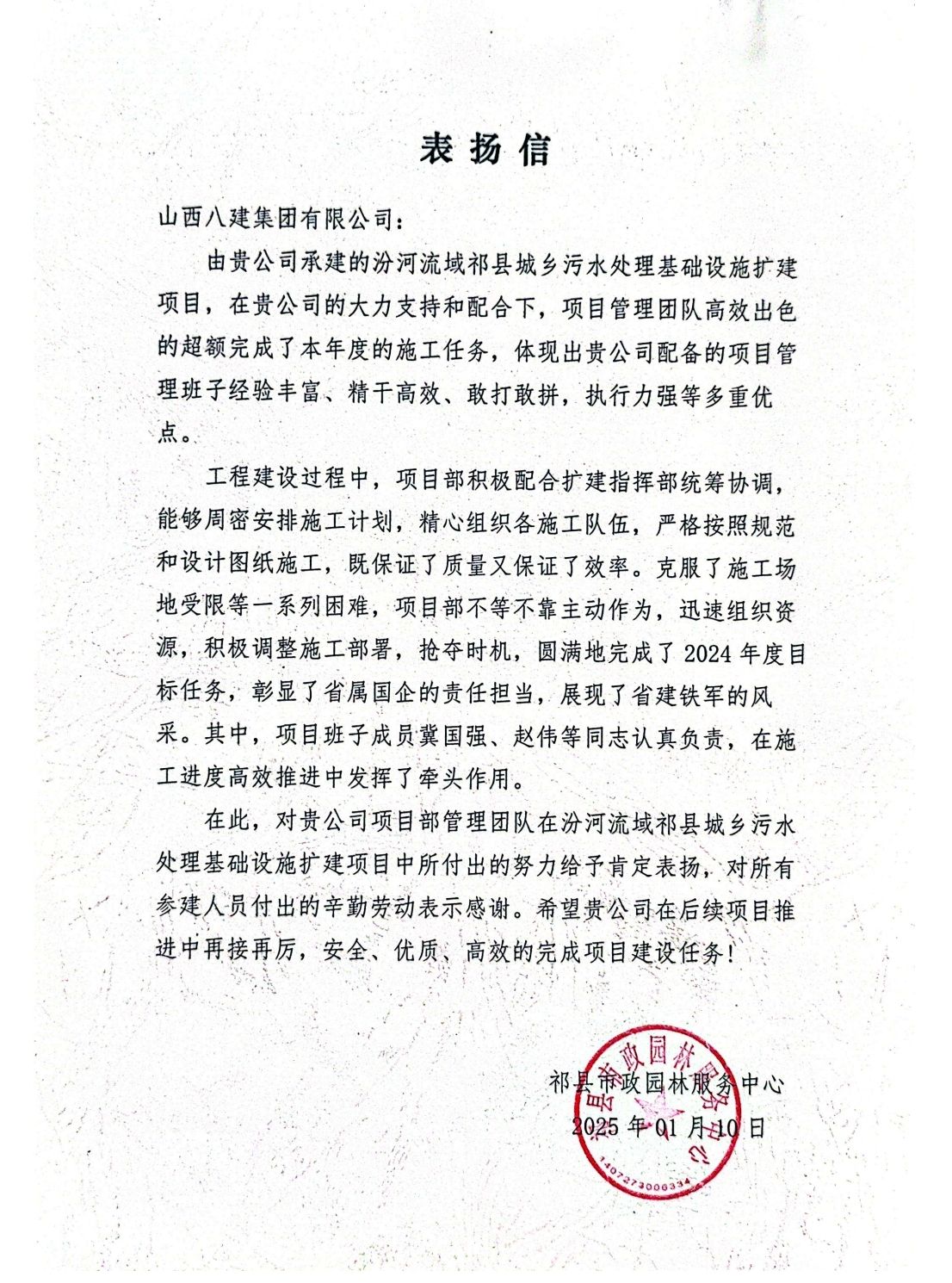 1月10日,山西建投八建集團(tuán)承建的簡(jiǎn)子溝城市棚戶區(qū)改造項(xiàng)目收到陽(yáng)泉市城際房地產(chǎn)開發(fā)有限責(zé)任公司的感謝信,汾河流域祁縣城鄉(xiāng)污水處理基礎(chǔ)設(shè)施擴(kuò)建項(xiàng)目收到祁縣市政園林服務(wù)中心的表?yè)P(yáng)信。信中對(duì)八建集團(tuán)在項(xiàng)目管理、施工進(jìn)度、安全文明施工等方面給予高度贊揚(yáng)。