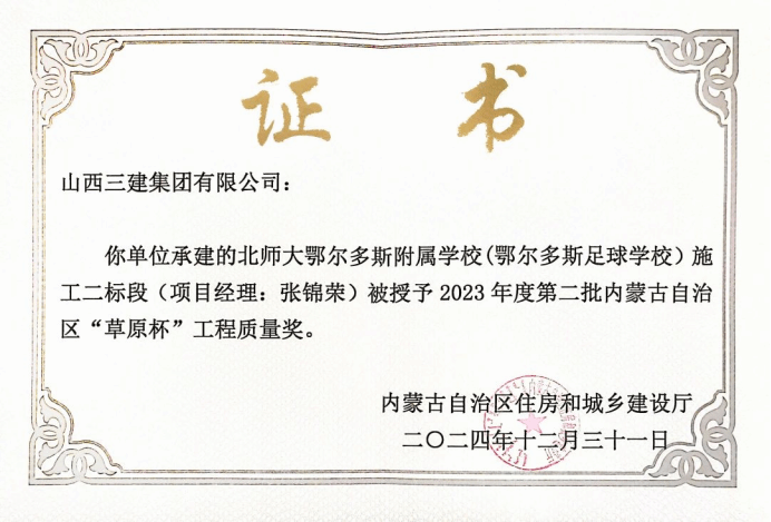 近日,從內蒙古自治區(qū)住房和城鄉(xiāng)建設廳傳來喜訊,山西建投三建集團承建的北師大鄂爾多斯附屬學校(鄂爾多斯足球學校)施工二標段,榮獲內蒙古自治區(qū)“草原杯”工程質量獎。