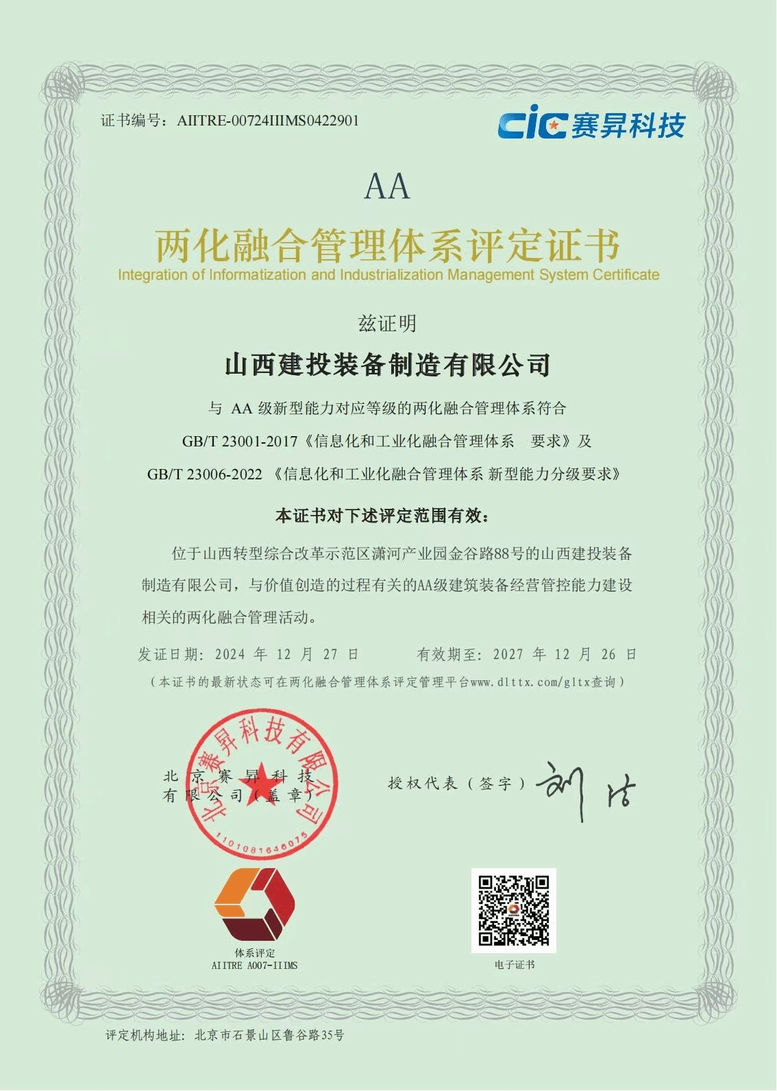 12月27日,山西建投工程機械公司順利通過國家兩化融合管理體系評定,并獲得AA級評定證書。