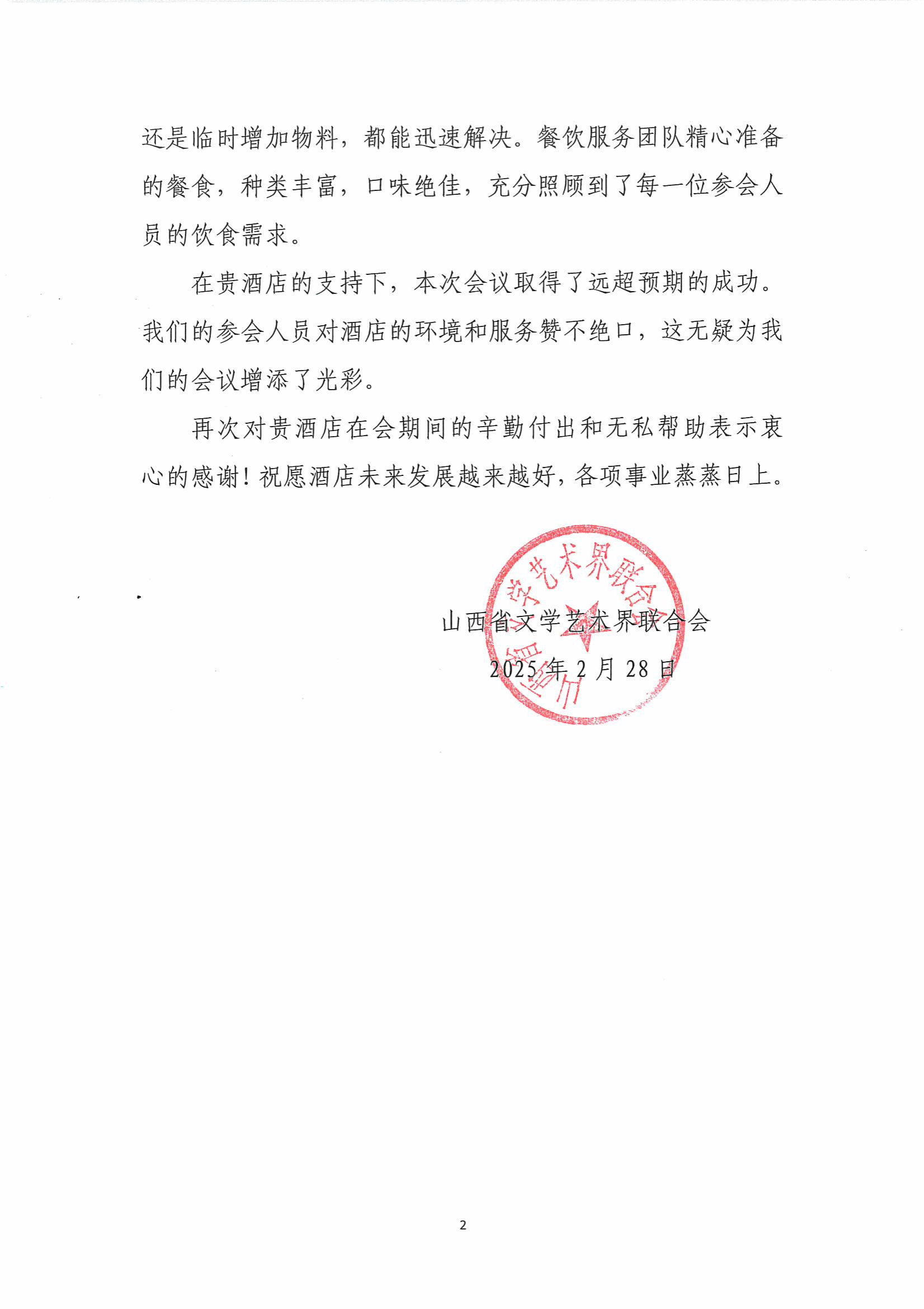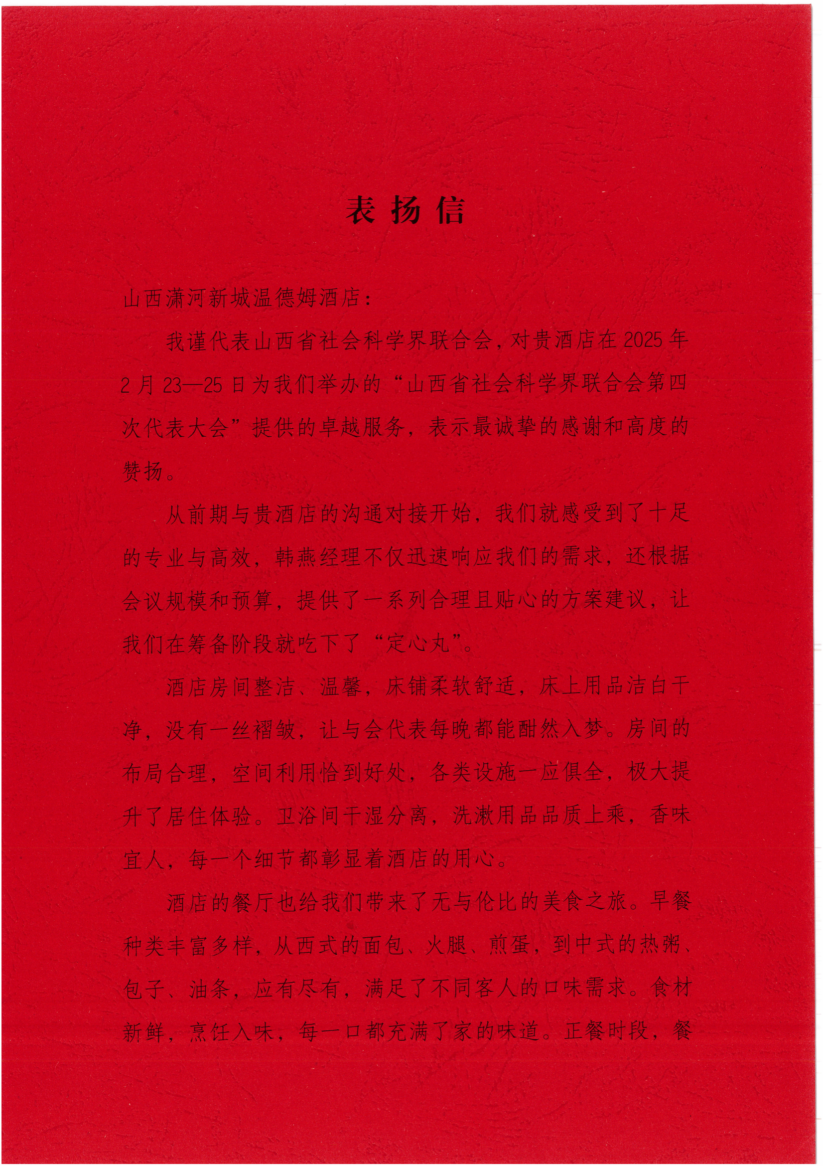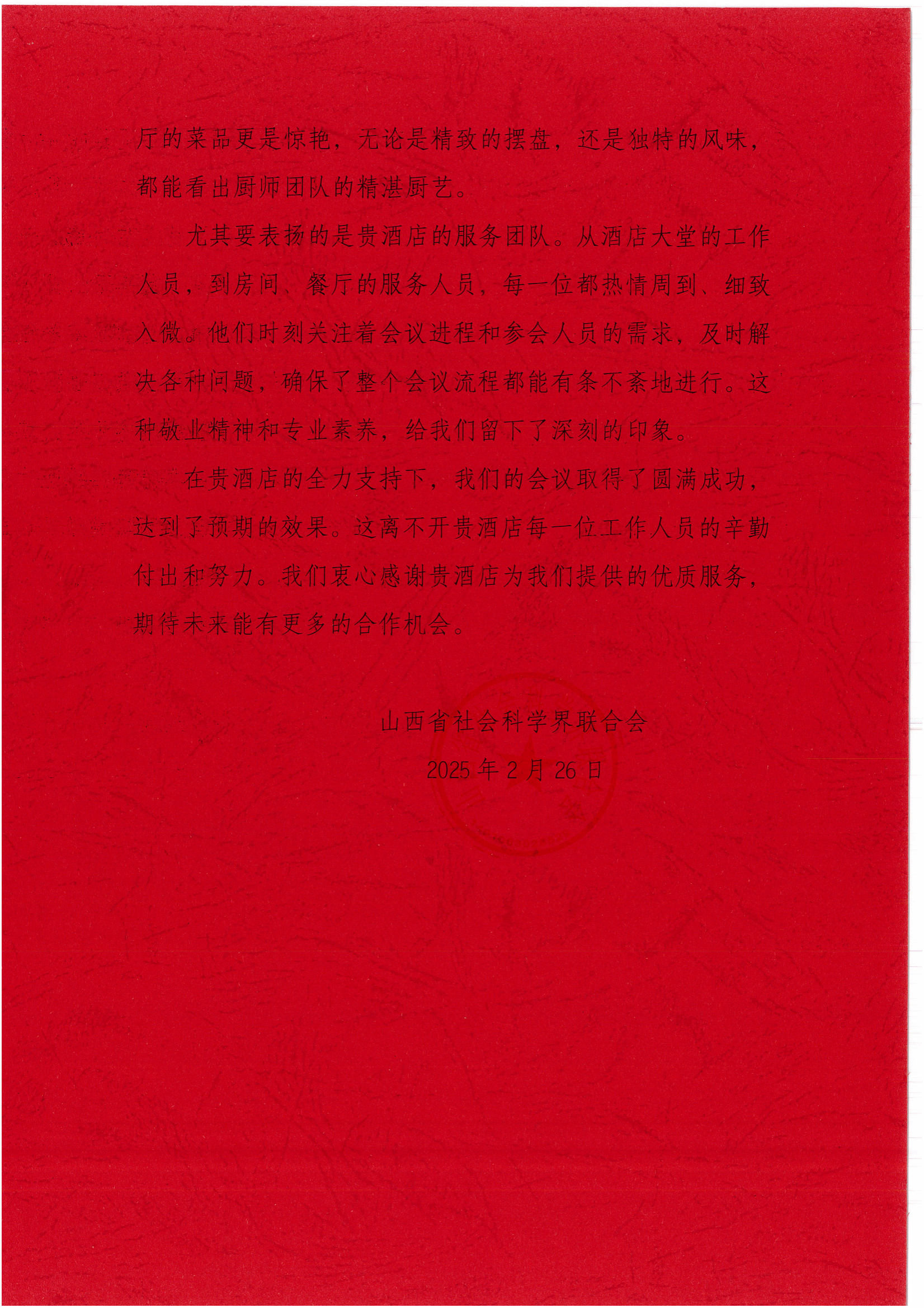 2月23日至25日,山西省文學(xué)藝術(shù)界聯(lián)合會第十次代表大會、山西省作家協(xié)會第八次代表大會、山西省社會科學(xué)界聯(lián)合會第四次代表大會召開。山西瀟河新城酒店群作為會議餐宿承接酒店,以高度的責(zé)任感、高標(biāo)準(zhǔn)的服務(wù)品質(zhì)獲得與會代表一致好評,喜獲山西省社會科學(xué)界聯(lián)合會、山西省文學(xué)藝術(shù)界聯(lián)合會發(fā)來的感謝信。
