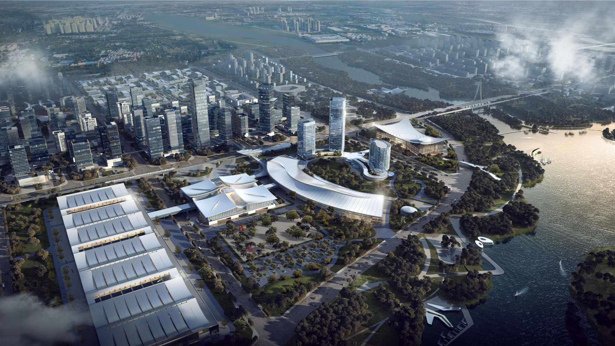 山西瀟河國際會展中心北側(cè)組團——鋼框架、矩形鋼管混凝土+下凹弧形倒三角空間鋼桁架,裝配率79%。